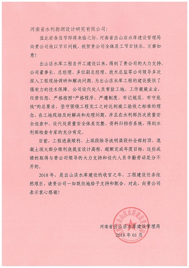 1月23日,公司收到河南省出山店水庫建設管理局發來的感謝信,對公司在工程建設中作出的貢獻表示感謝。